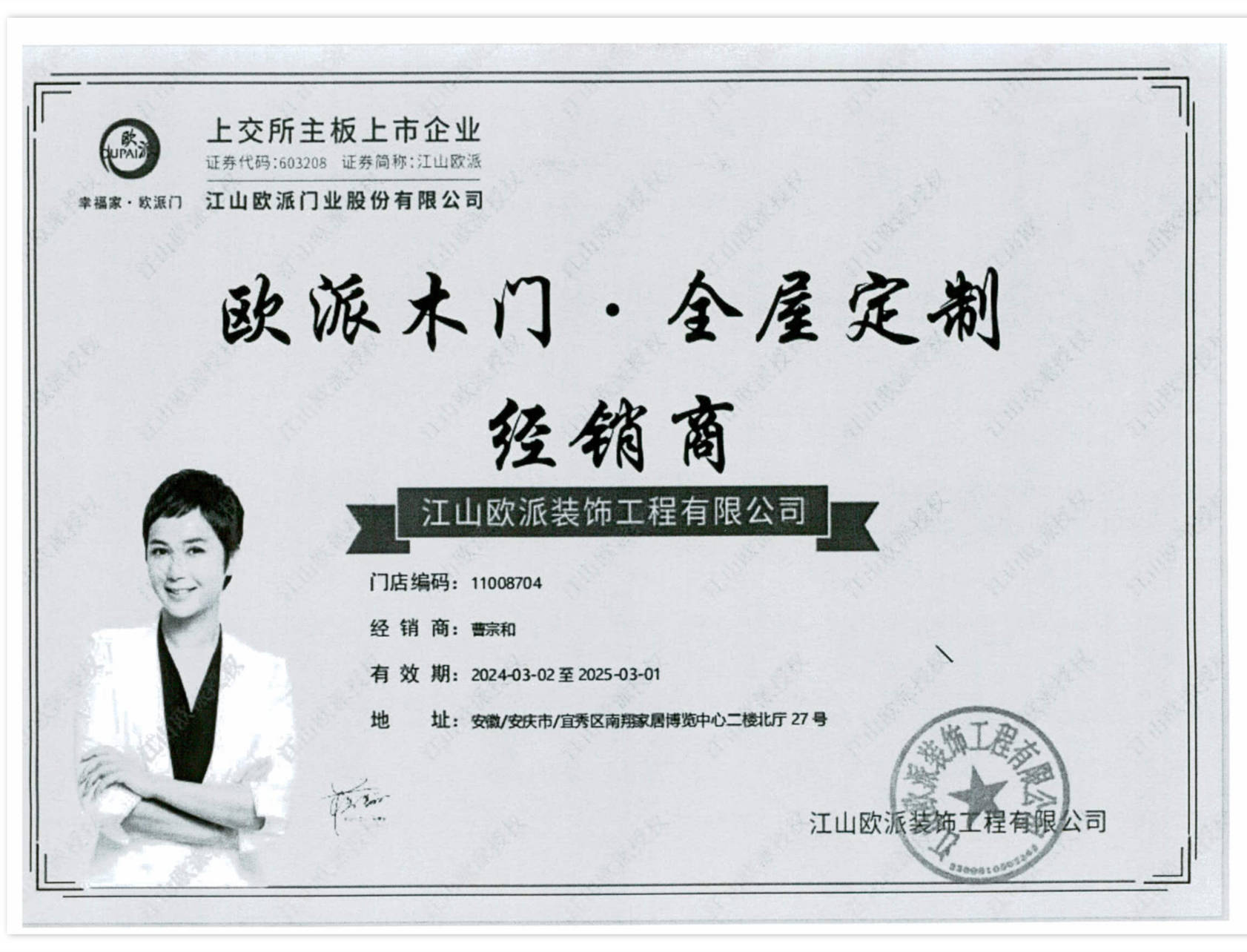 第五、《欧派门业全屋定制经销商》由江山欧派装饰工程有限公司单方制作,并加盖了 “江山欧派装饰工程有限公司”公章,印有蒋雯丽肖像和蒋雯丽签名,同样为复印件,既使为原件,也与来源于《肖像使用授权书》中的 “蒋文丽”相矛盾,未证明“蒋文丽”就是“蒋雯丽”。依法不予认可该证据。
