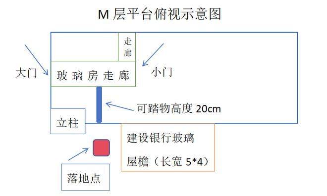 再从孩子的大致坠落地点来看:她也是在靠近窗户那片区域灯光照明充足的地方踏上第一层台阶的,否则毫无疑问会落在一楼建设银行门口的玻璃屋檐上,但是她的落地地点却是在建设银行门口的旁边,因为屋顶围栏的右侧尽头是一座立柱,其与一楼屋檐之间的空间是很窄的。