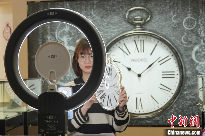 图为销售人员正通过直播带货推销漳州钟表。 漳州市龙文区融媒体中心 供图