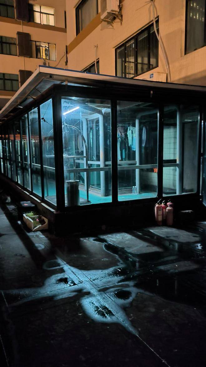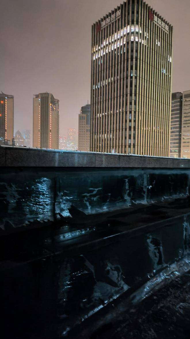 再从孩子的大致坠落地点来看:她也是在靠近窗户那片区域灯光照明充足的地方踏上第一层台阶的,否则毫无疑问会落在一楼建设银行门口的玻璃屋檐上,但是她的落地地点却是在建设银行门口的旁边,因为屋顶围栏的右侧尽头是一座立柱,其与一楼屋檐之间的空间是很窄的。